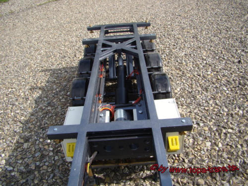 Hier ein paar technische Daten:Die Auflieger-Rahmen hat uns eine Bekannter nach unseren Vorgaben gefräst. Ursprünglich sollte es ein Schüttgut-Kipper werden. Aber Pläne ändern sich und so haben wir da ohne Vorbild ein Kipp-Containerchassis gebaut.Verbaut wurde:- 3 Achsen selber gedreht und an Luftfederatrappen von EBH-Style aufgehängt und zusätzlich sind zwei Achsen auf Liftbar mittels Spindel umgebaut.- Als Elektrik kommt ein 12er Auswertemodul von Brixl und 3 Thor Regler von CTI-Modellbau zum Einsatz.- Lackiert ist der Auflieger im Opel Moonlandgraumetallic